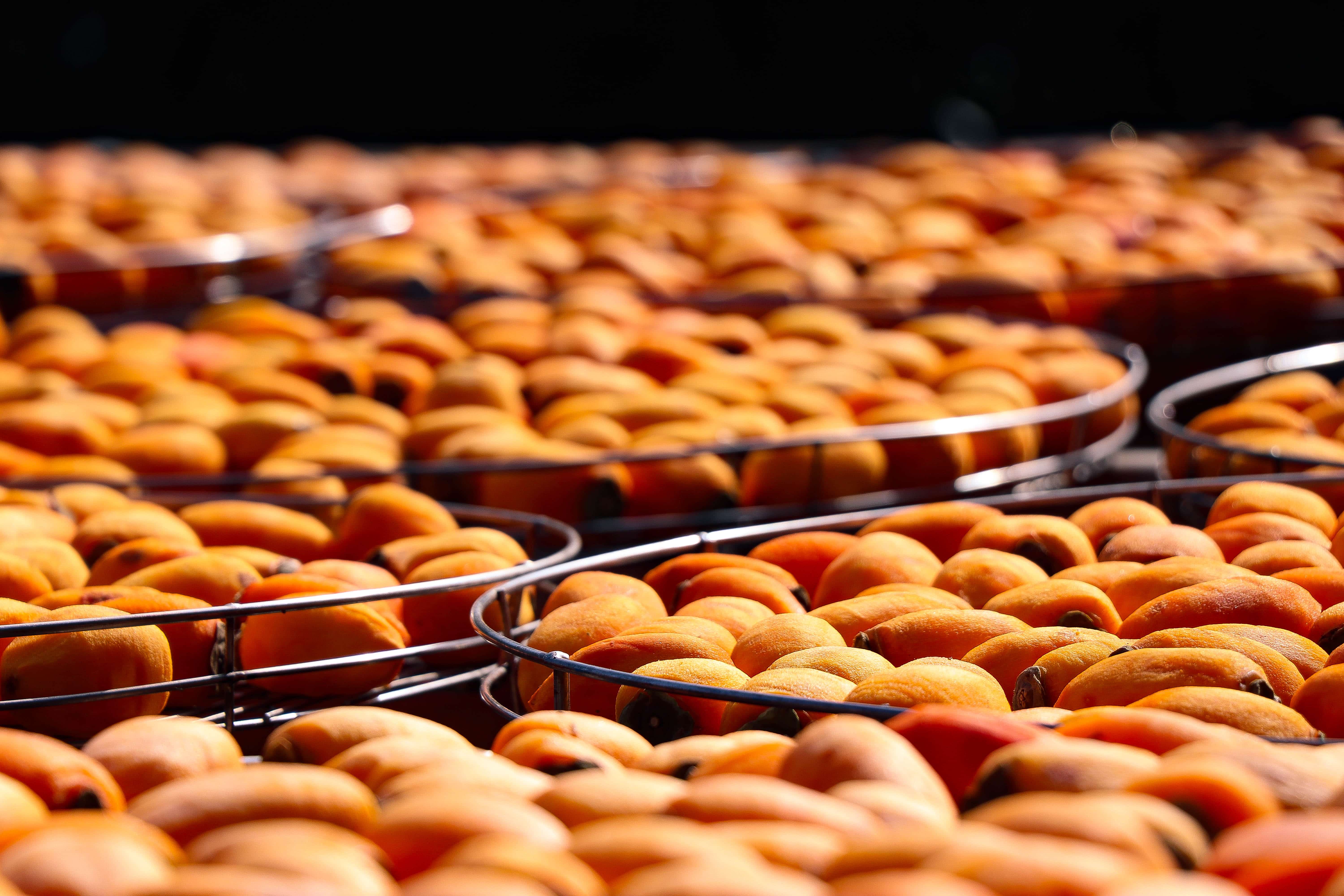 以前靠天氣吃飯,要兩點起床削皮,一直削到早上,才有一定數量能上棚架去曬太陽。直到後來父親研發乾燥機,省去繁複的日曬製程,卻發現柿餅與古法製作的風味相去甚遠,父子倆決定捨棄機器的偷吃步,堅持七至九天的繁複製作古法,選果、削皮、曝曬、捏翻等過程,可是一點兒也不馬虎。