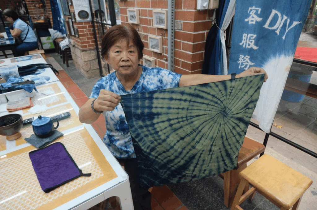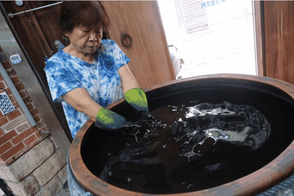 退休後返鄉的導覽志工謝佩樺,因解說工作而接觸藍染,最終深深著迷。她分享:「在遊客到來前,我們得提前數天備料、製染液,確保體驗時顏色最穩定。」她表示,希望遊客進入三峽的印象不只是金牛角或茶葉,也能記得這項被時間包裹的藍染故事。