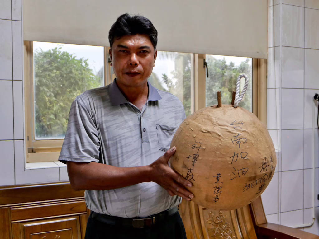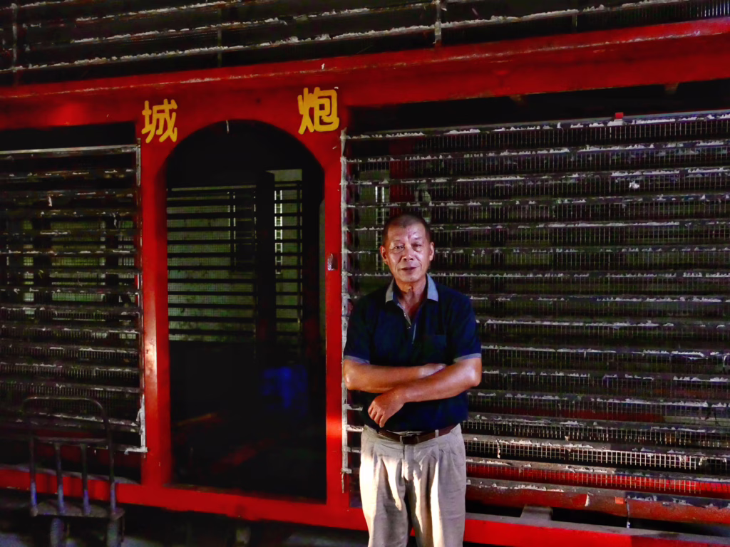 臺南市鹽水區橋南里里長陳榮斌展示自己2023使用至今的蜂炮炮城。攝影/陳彥辰