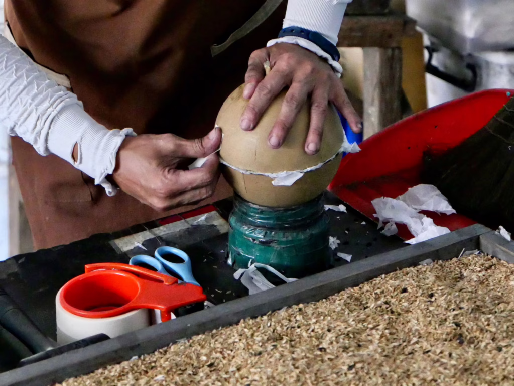 走進工廠,空氣中帶有淡淡硫磺味,是煙火原料特有氣息。從原料調和、比例控制、造粒、曬乾、合球、安裝導線到貼皮,煙火從無到有的每一道程序,都能在陳志昇的工廠內獨立完成,這些技術多依賴手工,步驟繁複且必須逐一處理。