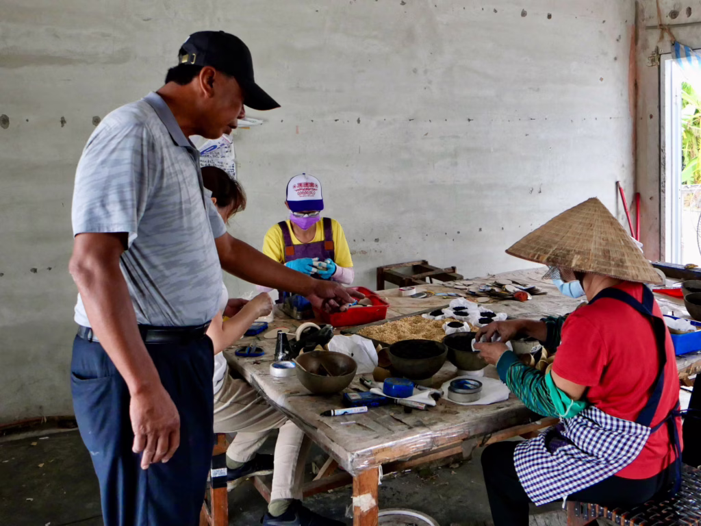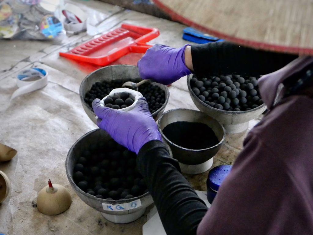 工人們按照陳志昇研究出的比例放入適量火藥,每一步都需要手工精準控制。攝影/陳彥辰