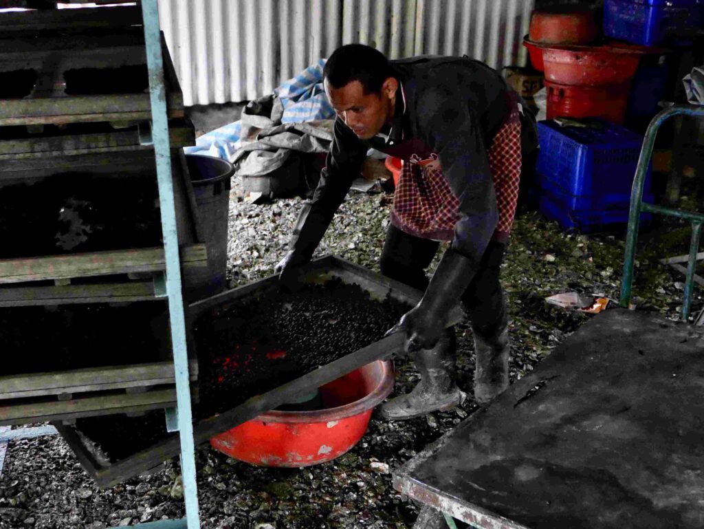 工場員工將造粒完成的火藥進行乾燥作業。攝影/陳彥辰