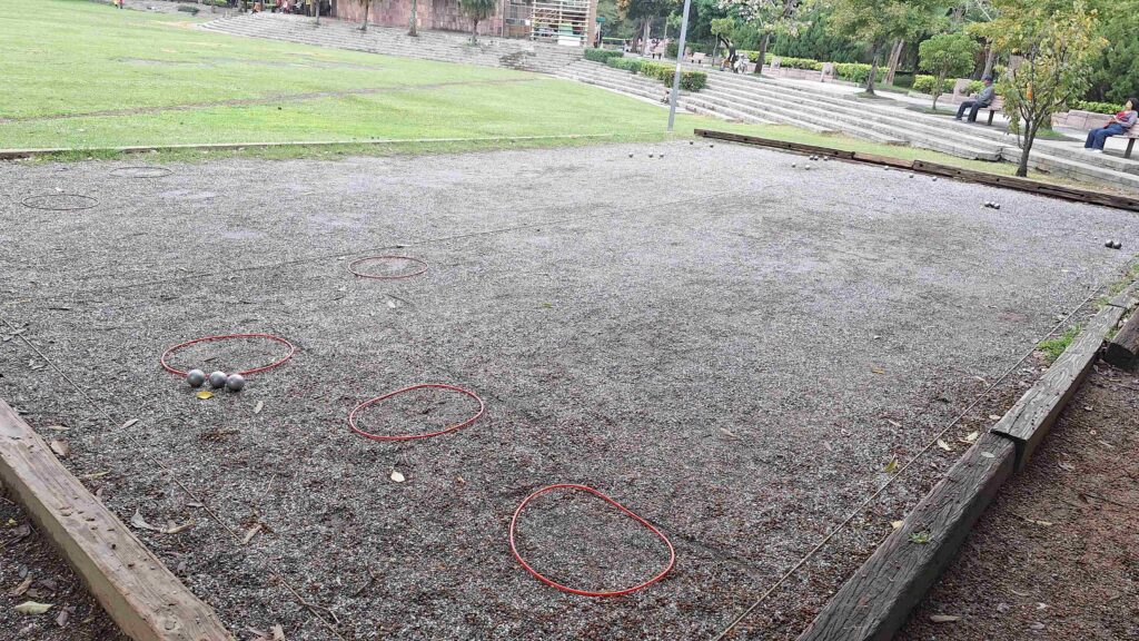 位於天母的天母滾球場長跟寬皆為符合比賽場地一樣,是附近學校練習和社區娛樂的地方。而圖上的工具都是天母國中訓練必須要的器材。攝影/黃莉容