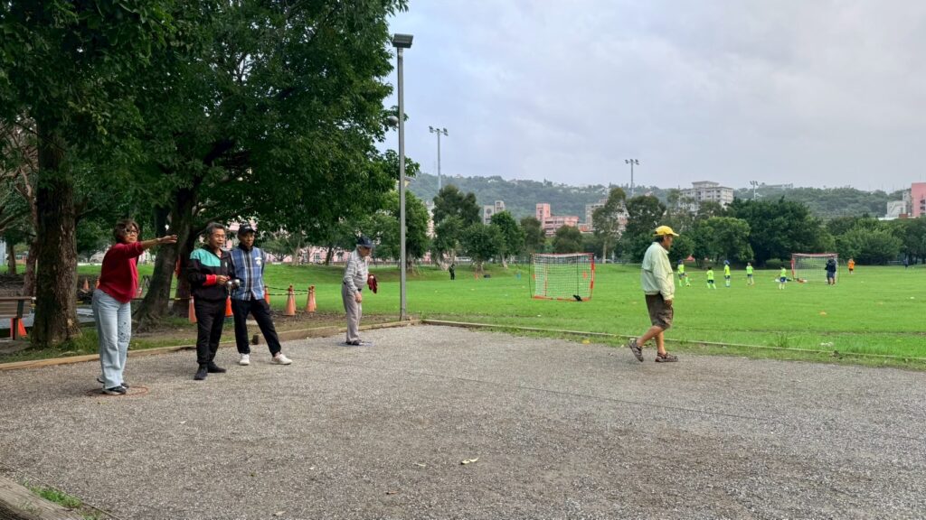 天母法式滾球場的銀髮族們練習與討論丟球位置。銀髮族們專注投擲的姿態,展現了滾球作為跨族群運動的休閒活動。攝影/郭妍綸
