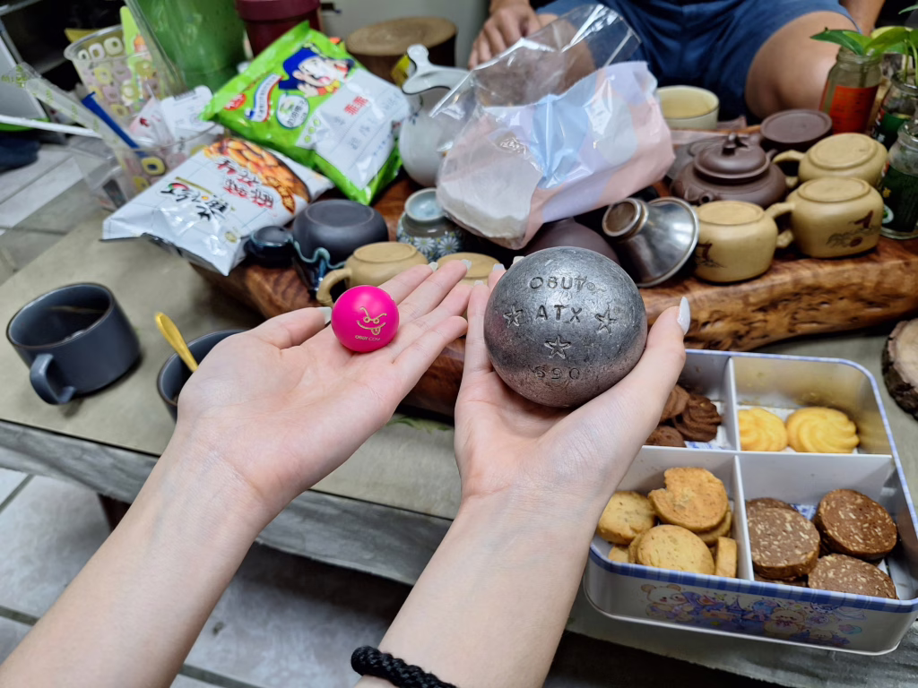法式滾球(右邊銀色球)與特製的目標球(左邊木質小球)。比賽的目標是將滾球投擲得盡可能靠近目標球,材質與大小的差異,使滾球的投擲策略更具挑戰性。攝影/黃莉容