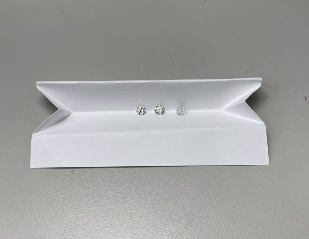 CVD鑽石(左)、天然鑽石(中)、未打磨過的高溫高壓鑽石(右)。攝影/李珺綺