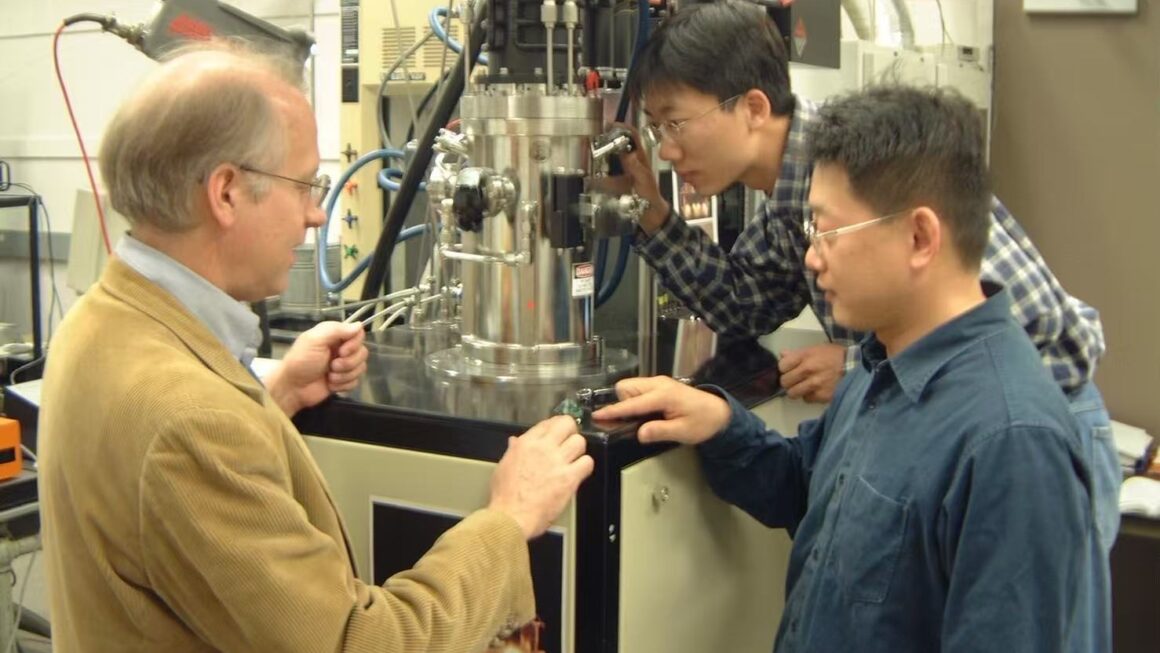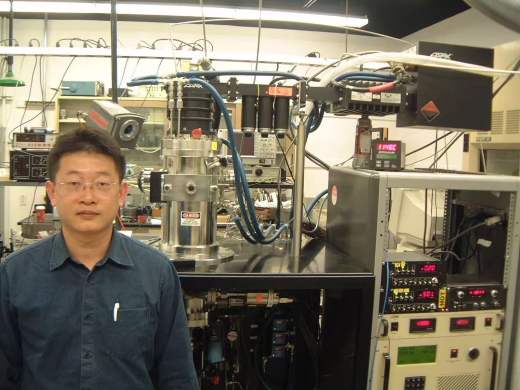 2004年顏志學在華盛頓卡內基研究所與鑽石製造機合影。照片提供/顏志學