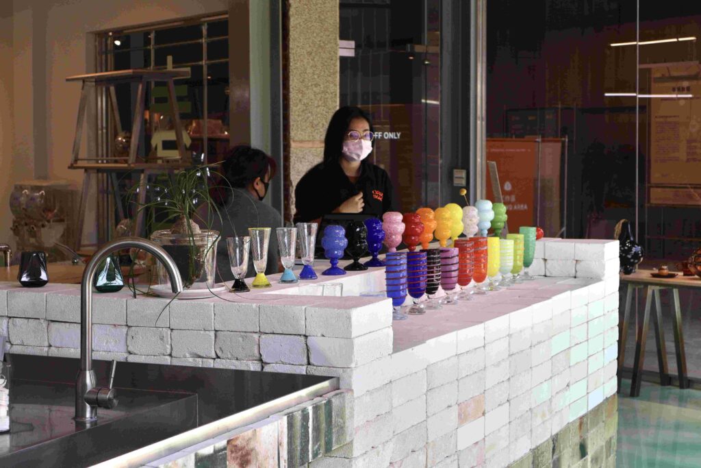 除了大規模的工業建材,再生玻璃也正嘗試走入美學領域。在「春室」體驗空間中,職人熟練地從攝氏1400度的高溫中取出熔化的玻璃吹製塑形,將廢棄酒瓶轉化為晶瑩剔透的工藝品。鄭振仕指出,相較於單純的口號宣導,這樣的感官體驗,不僅能讓參觀者更深刻體會資源再生的可能,也可以進一步提升大眾對環保議題的關注,縮短民眾與環保議題之間的認知距離。